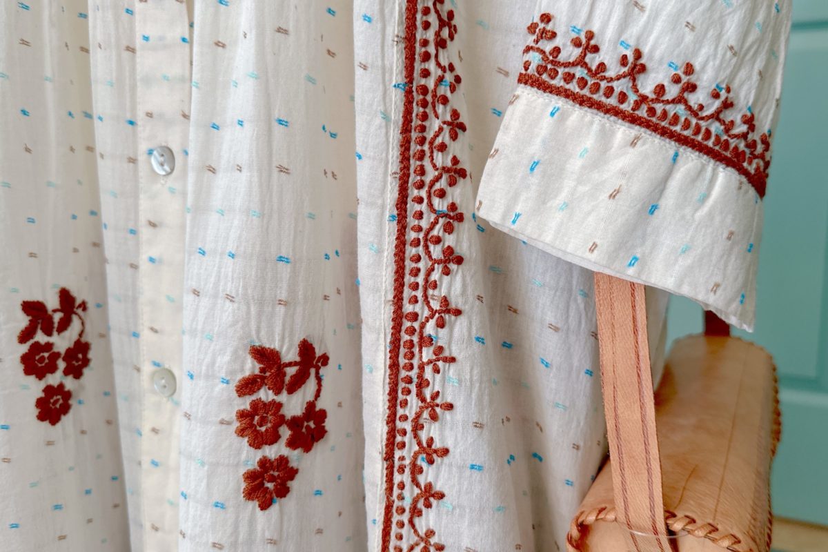 胸元から縦に流れる刺繍のラインや袖の花模様には、